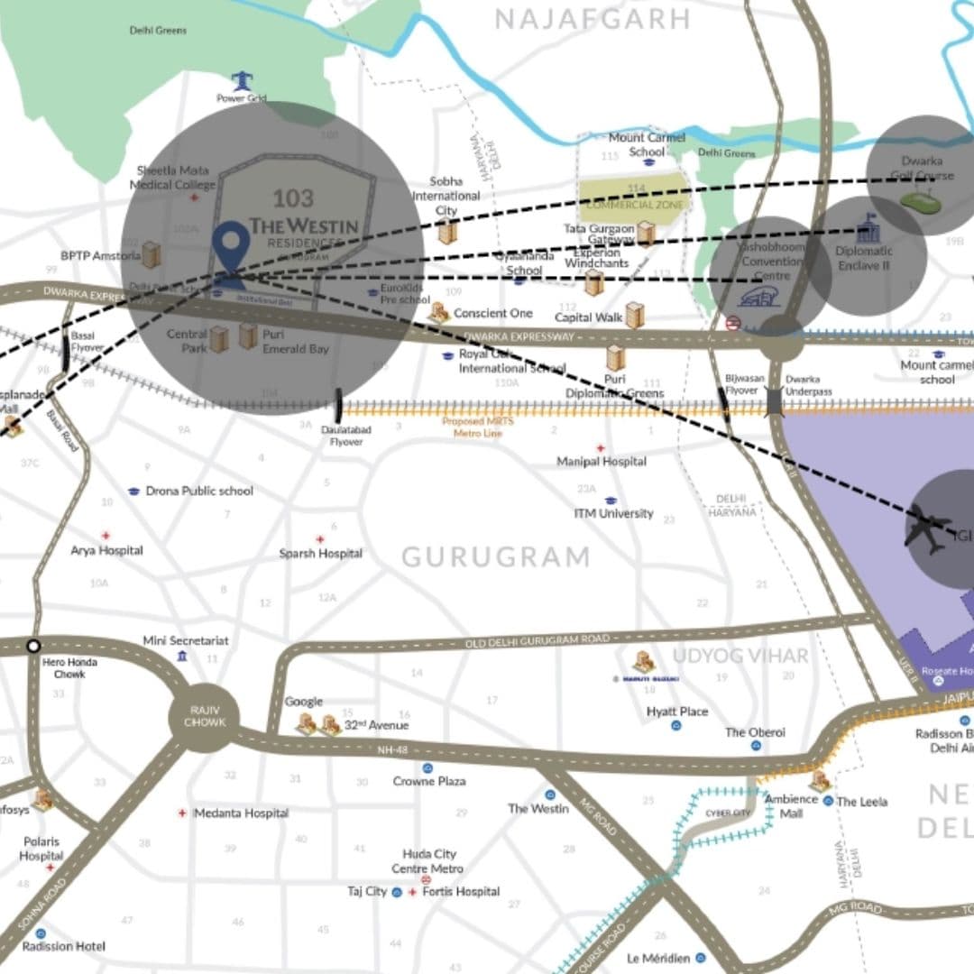 Westin Residences Whiteland is strategically located, it offers seamless connectivity to IGI Airport, Cyber City, Global City, and Delhi. RERA-approved (65, 66 & 67 OF 2024), this project is surrounded by top schools, hospitals, and commercial hubs.